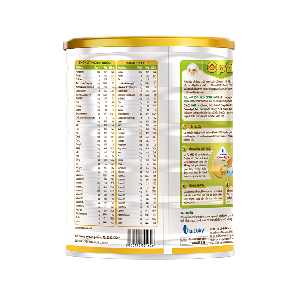 Colos Opti 1+ với công thức dinh dưỡng đầy đủ, khoa học, bổ sung Sữa non ColosIgG 24h độc quyền từ Mỹ, 2′-FL HMO, Lợi khuẩn Bifidus và hệ dưỡng chất vượt trội giúp bé tiêu hóa và hấp thu tốt, tăng cường hệ miễn dịch khỏe mạnh và phát triển toàn diện cả thể chất và trí tuệ.