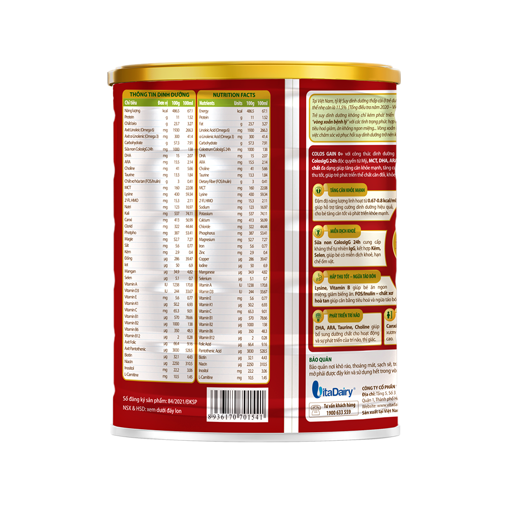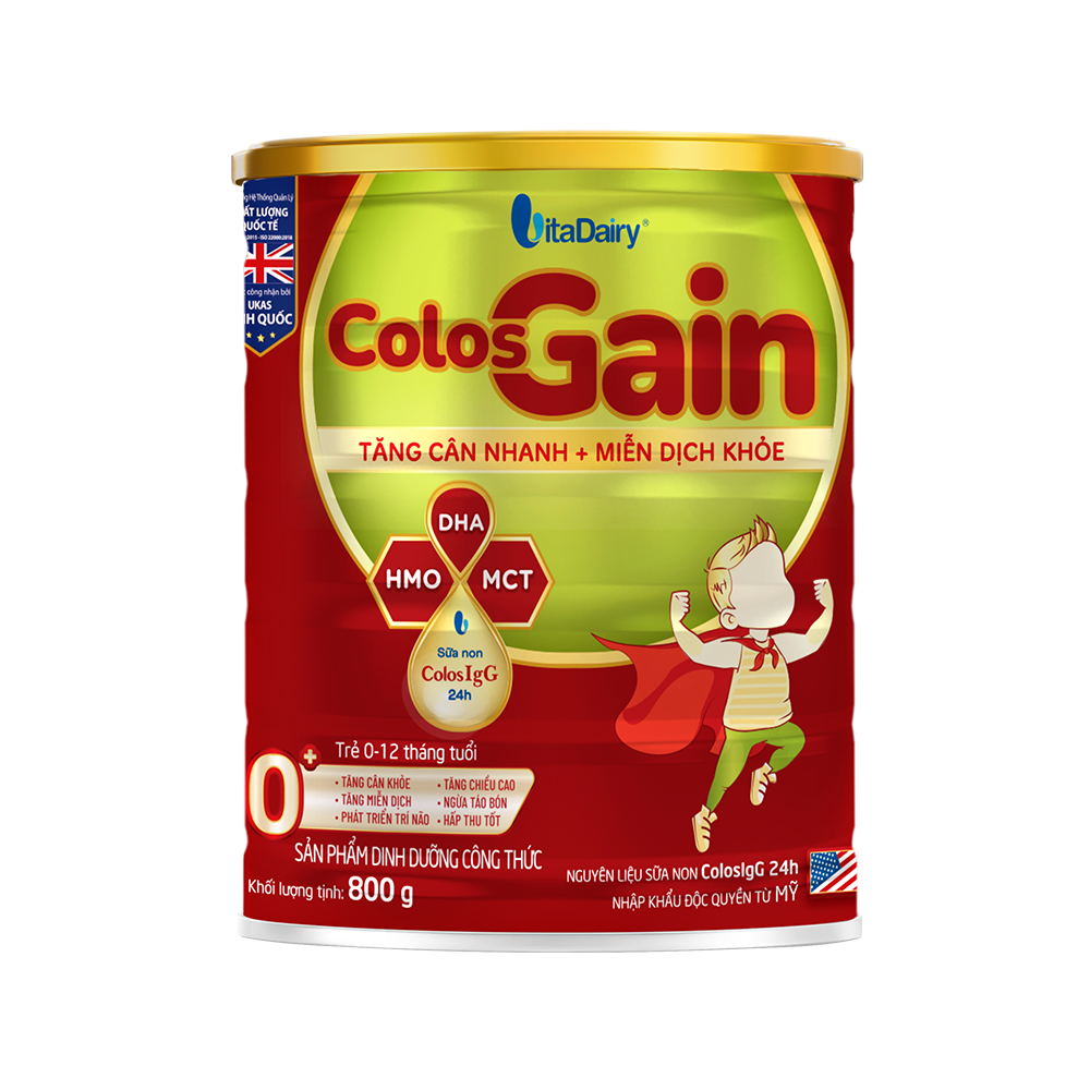 Colos Gain là sản phẩm dinh dưỡng đặc chế giúp trẻ có thể trạng suy dinh dưỡng, cải thiện các chỉ số về thể chất và tăng cường miễn dịch cho trẻ. Với công thức đột phá mới, được bổ sung nguyên liệu sữa non ColosIgG 24h do VitaDairy nhập khẩu độc quyền từ Mỹ giúp trẻ tăng cường miễn dịch, hạn chế ốm vặt.