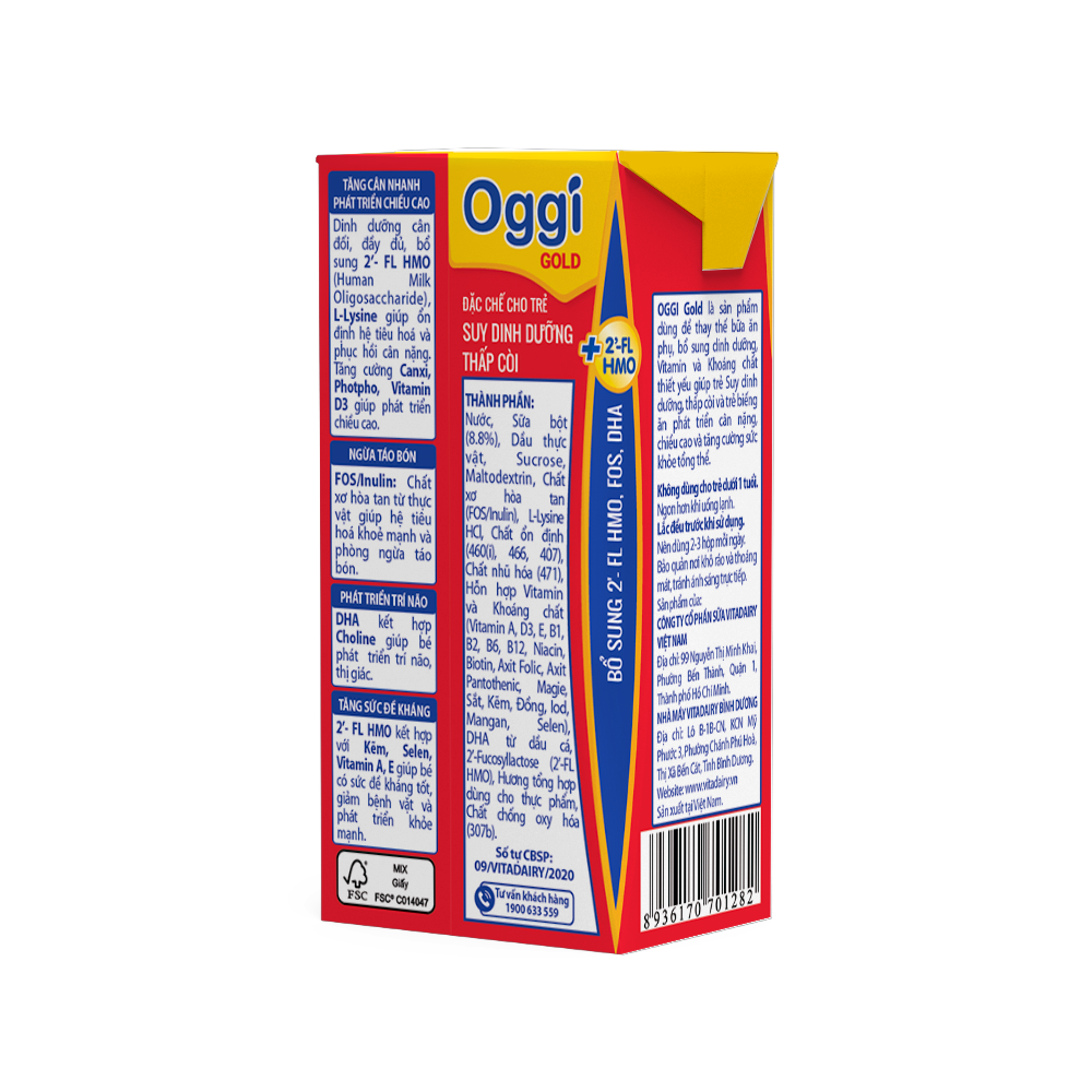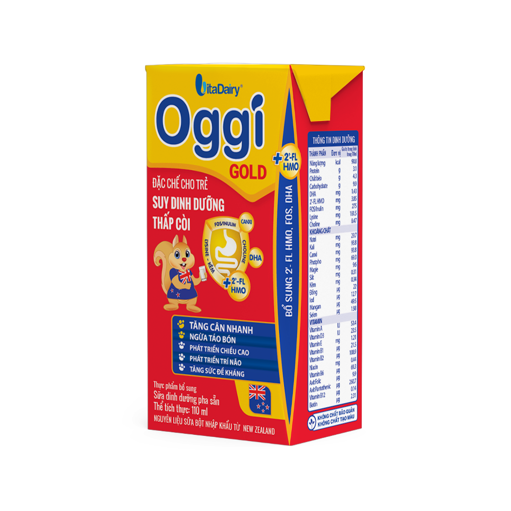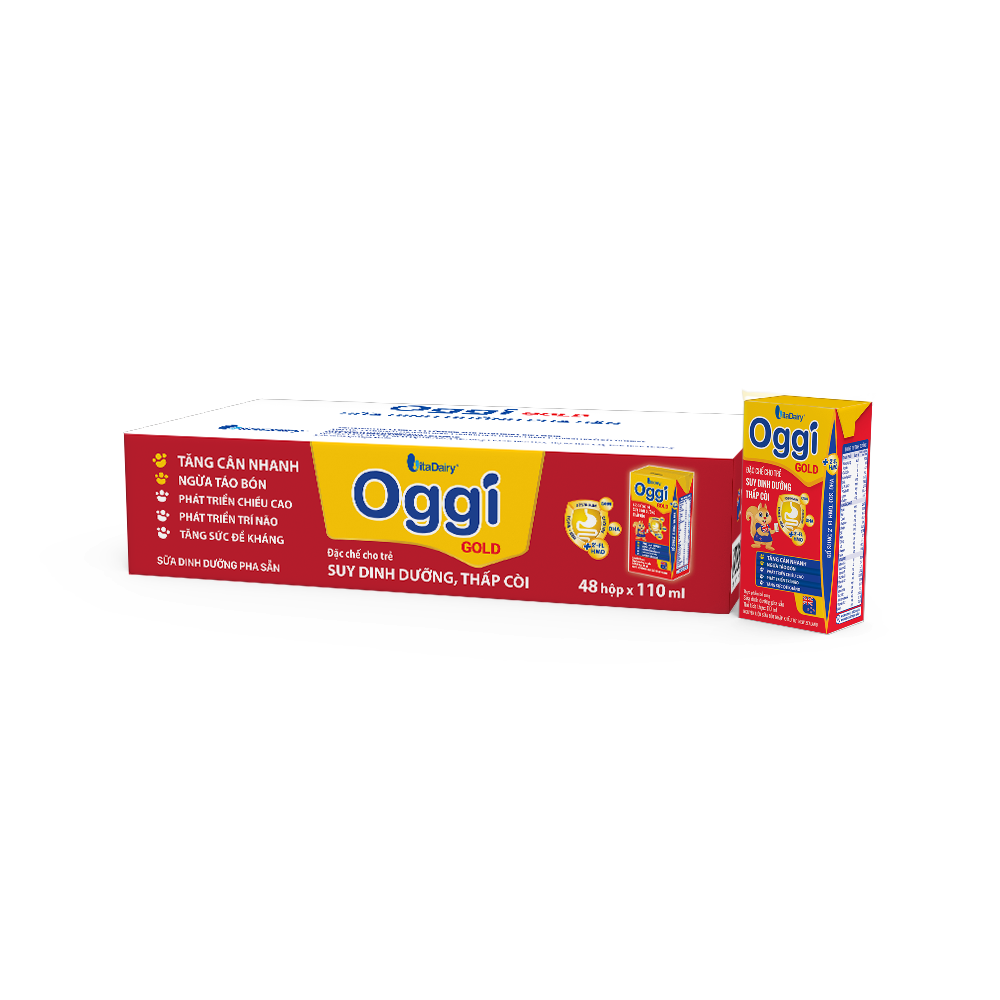 Sữa Bột Pha Sẵn. Oggi Gold là sản phẩm dùng để thay thế bữa ăn phụ, bổ sung dinh dưỡng, Vitamin và Khoáng chất thiết yếu giúp trẻ Suy dinh dưỡng, thấp còi và trẻ biếng ăn phát triển cân nặng, chiều cao và tăng cường sức khỏe tổng thể. Sản phẩm có nguyên liệu sữa bột được nhập khẩu từ New Zealand.